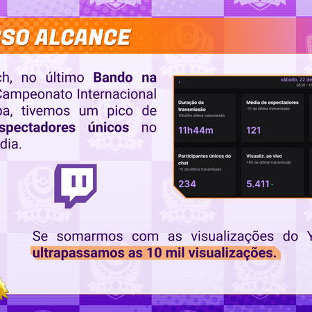 41 anos, streamer, narrador de e-sports, caster brasileiro oficial de Pokémon Unite e idealizador da maior comunidade de jogadores do título no Brasil: o BANDO! O conheci numa convenção no início de 2024 e, desde então, pude colaborar com seus projetos, seja na sua bancada de streamers, seja através de meus conhecimentos formais. Nesta seção, temos: 1. A vinheta de abertura para a cotransmissão do LAIC, da qual fui responsável pela realização integral, da pré até a pós-produção; 2. Algumas páginas de um mídia kit desenvolvido para a prospecção de investidores dos maiores projetos do canal.